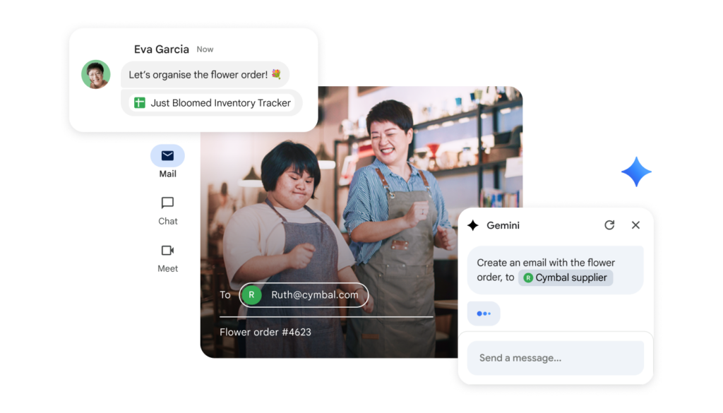 Assistente nativo para escrever e-mails, resumir reuniões no Meet e analisar dados em planilhas.